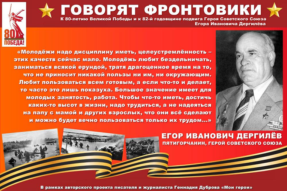 82 года назад, 25 сентября 1943-го, Егор Иванович Дергилёв совершил свой главный подвиг, за который был удостоен звания Героя Советского Союза. Было невероятно интересно слушать неторопливый рассказ увенчанного ратной славой фронтовика, а он, видя интерес в моих глазах, был рад поделиться воспоминаниями. В итоге за кадром осталось много интересного... Сегодня в рамках проекта писателя и журналиста Геннадия Дуброва «Говорят фронтовики» – о главном подвиге Егора Ивановича Дергилёва и о его словах, обращённых к молодёжи.