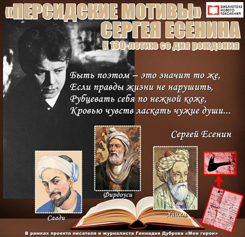 В день рождения Сергея Есенина, в его 130-летний юбилей, вспомним о том, что он читал, а читал поэт много, полюбив и оценив это полезное занятие ещё в раннем детстве. Одним из его читательских увлечений были восточные поэты-мыслители, творчество которых подвигло его на создание даже собственного цикла под названием «Персидские мотивы», состоящего из 15 стихотворений! Он был начат в сентябре 1924 года и закончен в августе 1925-го. Персия, Тегеран, Хороссан, Багдад, Босфор... Эти названия, как прекрасные самоцветы, вкраплены в канву поэтического повествования. И это при том, что до Персии, в которую Сергей Есенин рвался, он так и не доехал, а восточной экзотикой напитался в поездке в Баку, Тбилиси и Батум. О перекличке Есенина с персидскими поэтами Саади, Фирдоуси и Хайямом и о загадке «свиного рыла» в очерке писателя и журналиста Геннадия Дуброва…