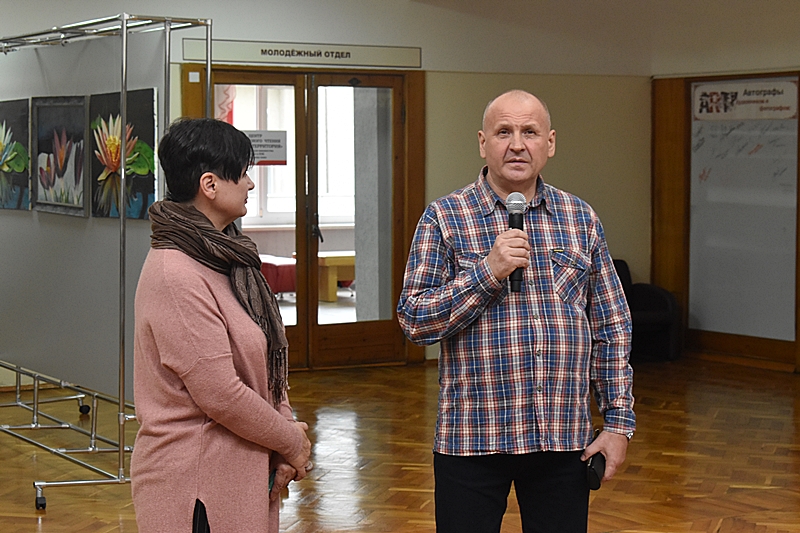 В эти осенние, неожиданно холодные дни, Арт-пространство «Вернисаж» представляет читателям библиотеки яркую и необычную выставку живописи, посвященную насекомым и птицам под названием «Цветы, бабочки и птицы». С полотен на зрителя смотрят гигантские бабочки и птицы, написанные по особой технологии,изобретенной художником для придания изображению дополнительного объема.