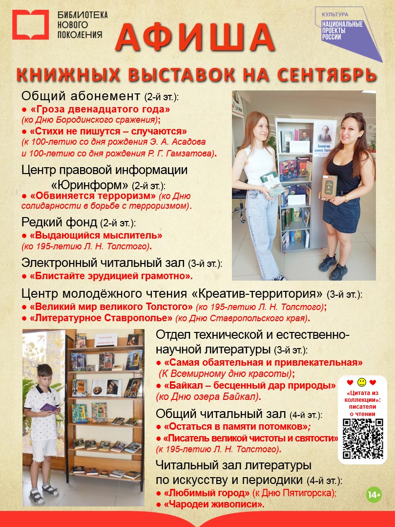 Центральная городская библиотека им. М. Горького приглашает всех, кто любит чтение, на книжно-иллюстративные выставки, открывшиеся в сентябре. Как всегда, сотрудники библиотеки подобрали для Вас интересные книги разных лет: как книжные новинки, так и издания, которые выходили в разные годы советской эпохи. В сентябре мы отметим День Ставропольского края, День города Пятигорска, 220-летие Кавказских Минеральных Вод. Выставки подготовлены к Всемирному дню красоты, ко Дню солидарности в борьбе с терроризмом, ко Дню озера Байкал. Сентябрь богат на юбилейные литературные даты. 100-летие со дня рождения отмечают Эдуард Асадов и Расул Гамзатов. 195 лет исполняется в этом месяце Льву Толстому, которого помнит наш город (он останавливался здесь, лечился и работал, создал ряд бессмертных шедевров), его произведения, как и книги о нём, ждут своих читателей.