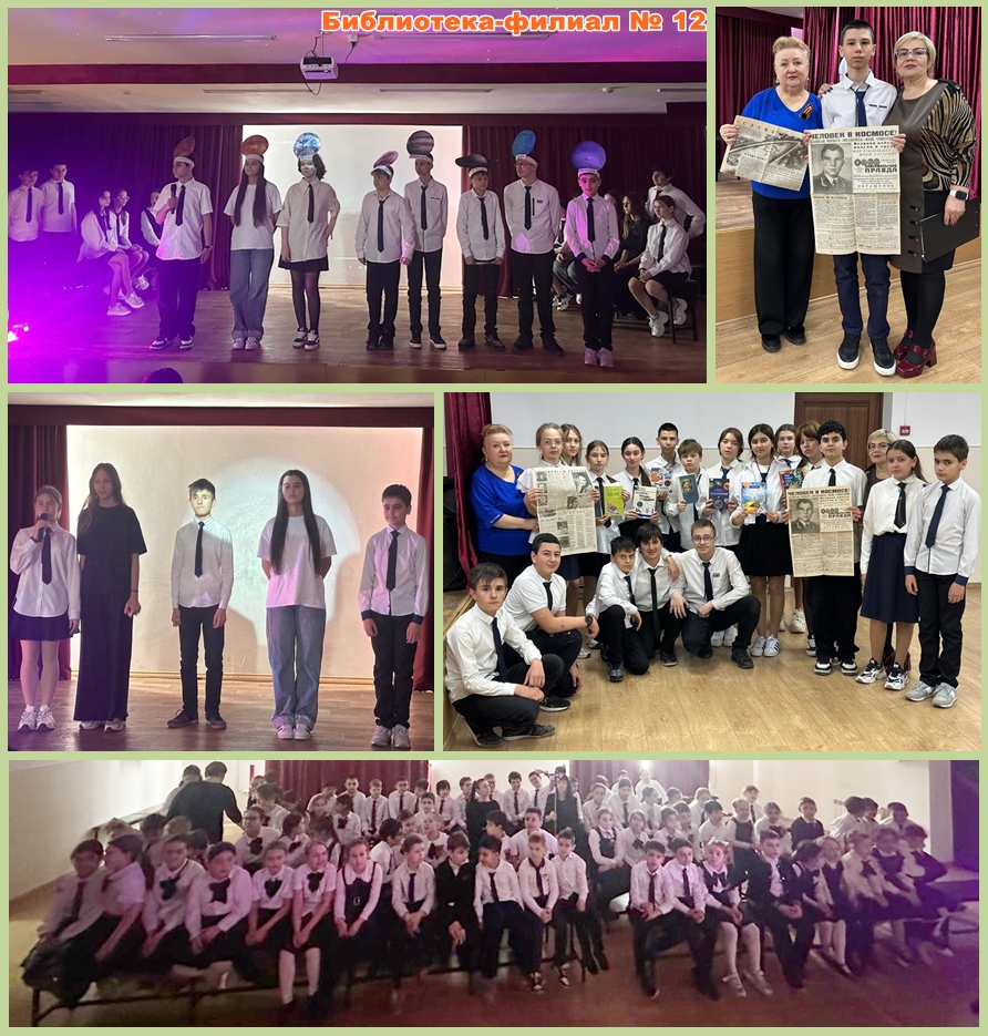 Библиотека-филиал № 12 помогла учащимся 1-7 классов школы «Геула» на празднике, посвящённом Дню космонавтики, поставить на сцене мини-спектакль «Все мы дети космоса», роли в котором сыграли шестиклассники, а другие классы подготовили композиции о космосе, и все вместе отвечали на вопросы викторины и ознакомились с книгами о космосе и копией газеты «Комсомольская правда» за 13 апреля 1961 года!