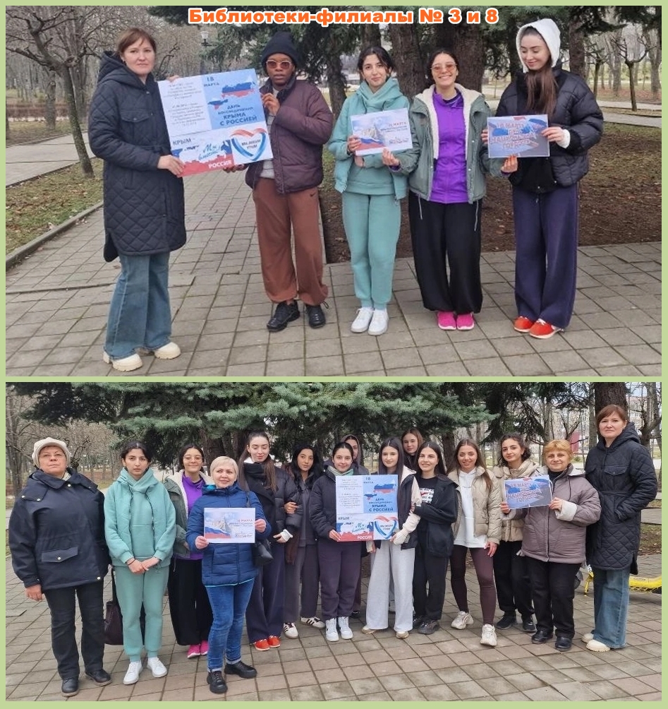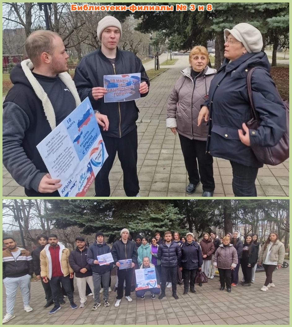 Сотрудники библиотеки-филиала № 8 совместно с библиотекой-филиалом № 3 провели в Комсомольском парке патриотическую акцию «Россия и Крым едины». Её участниками стали студенты 2-го курса Пятигорского медико-фармацевтического института. Библиотекари рассказали им об исторических событиях, связанных с воссоединением Крыма с Россией.