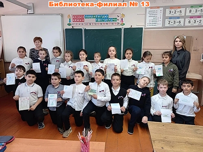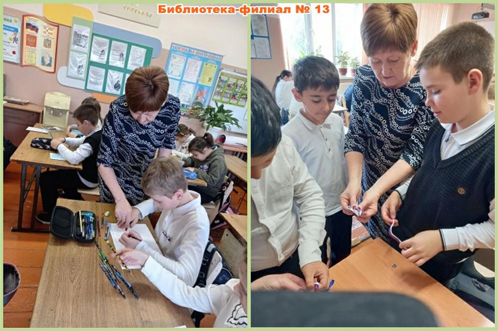 Библиотекой-филиалом № 13 совместно с сотрудниками Дома культуры пос. Нижнеподкумский на базе школы № 24 был проведён патриотический час «Мы вместе, мы едины», посвящённый Дню воссоединения Крыма с Россией. Школьники нарисовали открытки для участников СВО, написали им добрые слова, а во время мастер-класса изготовили броши «Триколор».