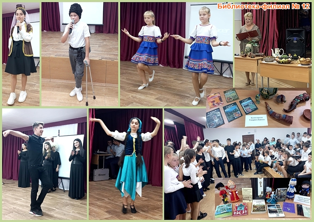 Сотрудники библиотеки-филиала № 12 провели для учащихся школы «Геула» информационный час «Праздники, обычаи, обряды народов Ставропольского края» в рамках акции «Ставрополье – родное, народное, моё». Ребята узнали о традициях и обычаях многонациональных народов, живущих на Ставрополье, познакомились с кавказской кухней. Учащиеся представили концертные номера: в программе прозвучали стихи и песни на иврите, армянском, грузинском, азербайджанском, табасаранском, греческом языках, а также были представлены национальные танцы.