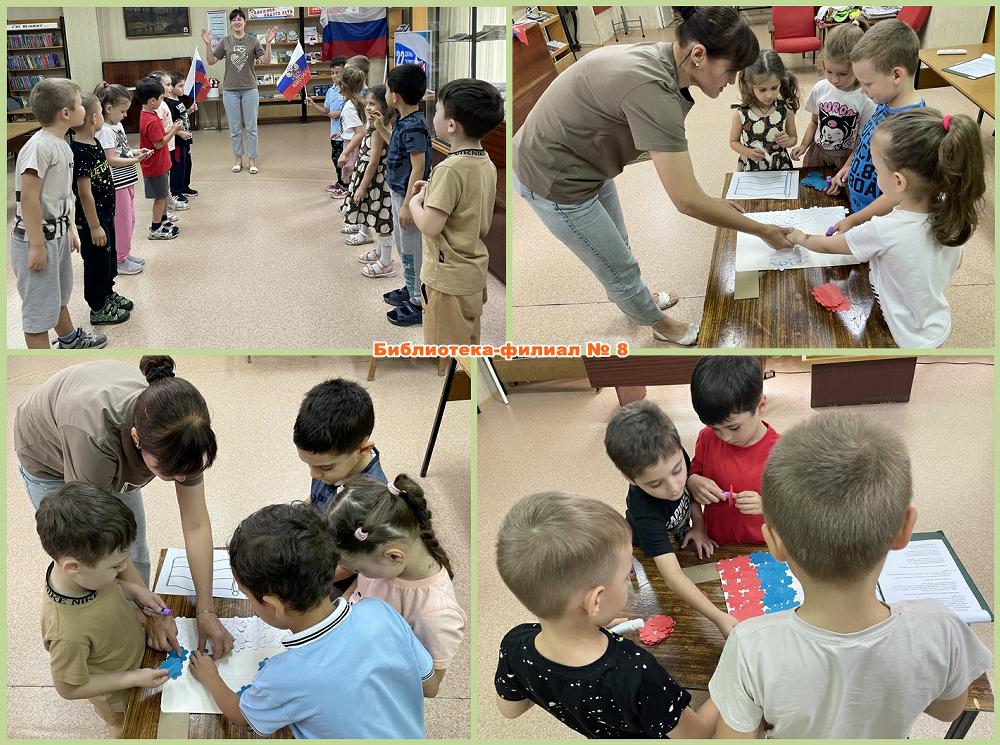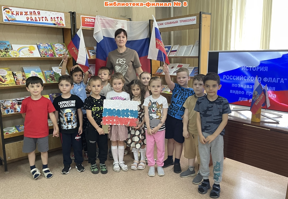 В библиотеке-филиале № 8 для воспитанников детского сада № 39 «Буратино» был проведён патриотический час «И вечно будем славить мы в веках российский триколорный флаг». Дети приняли участие в играх «Белый, синий, красный» и «Передача флага в шеренге», отгадывали загадки о флаге и собрали макет триколора.