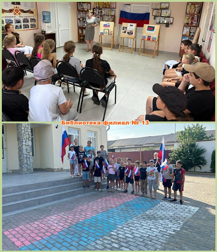 В библиотеке-филиале № 13 совместно с ДК пос. Нижнеподкумский был проведён патриотический час «Душа России в её символах», во время которого его участники ответили на вопросы праздничной викторины и нарисовали триколор цветными мелками.