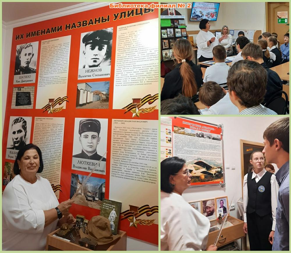 В библиотеке-филиале № 2 для учащихся 7-го класса школы № 30 был проведён урок мужества «Они отстояли Кавказ». Заведующая библиотекой Нина Макухина рассказала юным читателям об этапах битвы за Кавказ и о Героях Советского Союза, имена которых носят улицы Новопятигорска, остановившись более подробно на Борисе Калинкине. Ребята посетили музей при библиотеке, ознакомившись с его экспонатами и с новым стендом о наших земляках – военнослужащих, погибших в ходе СВО.
