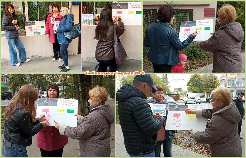 Сотрудники библиотеки-филиала № 8 провели акцию «Наркомания – путь в никуда» с целью привлечь общественность к участию в противодействии незаконному обороту наркотиков и профилактике их употребления. Жители микрорайона высказали своё отношение к проблеме, получившей сегодня огромное распространение в России: категорическое неприятие и желание, чтобы государство приложило все усилия в борьбе с распространением наркотиков.