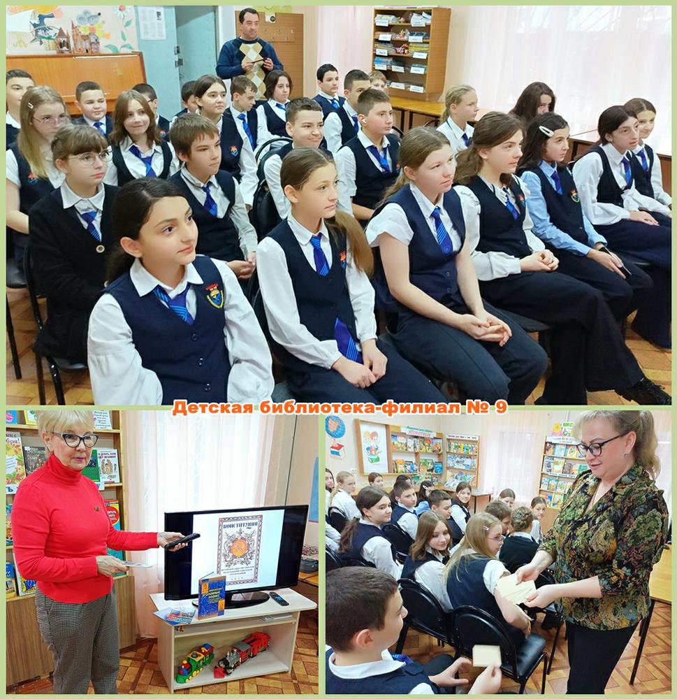 Сотрудники детской библиотеки-филиала № 9 провели для учащихся 6-го класса школы № 19 историко-познавательный турнир «Главная книга страны». Ребята узнали об истории принятия документа, основных правах и обязанностях граждан, закреплённых в Конституции РФ, познакомились с понятиями «Федерация», «Президент», «Правительство РФ», «Конституция РФ». После чего поговорили о символах государства – Гимне, Флаге и Гербе, спели Гимн России и услышали другие варианты гимнов. Ответы ребят на вопросы викторины и их активность продемонстрировали, что они – достойные граждане своей страны и являются надёжным будущим России.