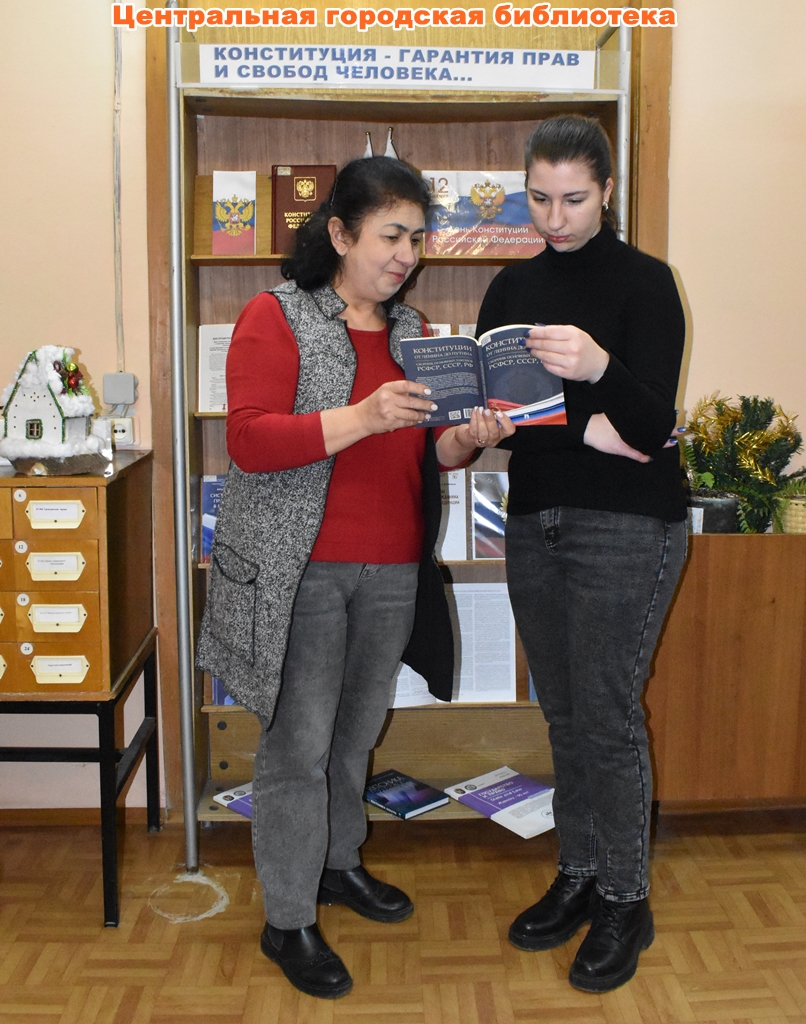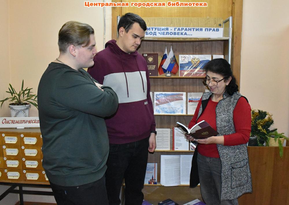 В Центральной городской библиотеке в Центре правовой информации «Юринформ» проходят обзоры у книжно-иллюстрационной выставки «Конституция – гарантия прав и свобод человека», на которой представлены книги и периодические издания, знакомящие с главным законом страны. Все участники тематических фотосессий, с которыми мы беседуем на тему правовых знаний и чтения, получают в подарок книжные закладки, выпущенные Пятигорской библиотекой в рамках проекта «Умная книжная закладка» и рассказывающие о поэтах, писателях, их произведениях и о героях Пятигорска.