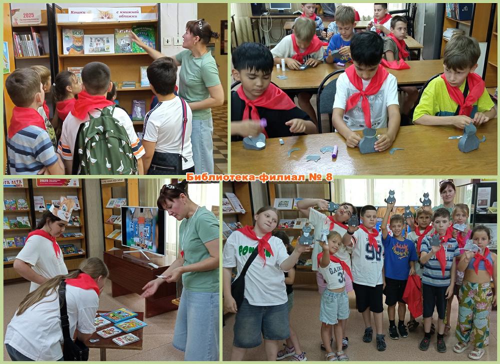 В библиотеке-филиале № 8 для ребят из лагеря летнего отдыха при гимназии № 4 было проведено литературное путешествие «Гуляют кошки по страницам», приуроченное к Всемирному дню кошек.
