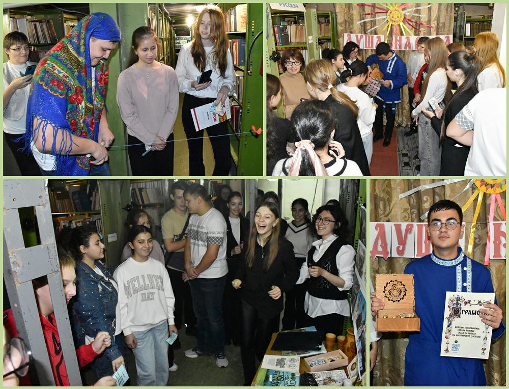 Как всегда, в эту волшебную ночь открылась «святая святых» Горьковской библиотеки – книгохранилище! Здесь, в таинственной атмосфере полумрака и в окружении книг расположилась локация «Застава Добрыни Никитича». На этой площадке гостям предстояло пройти по этнолабиринту – вспомнить ратные подвиги былинных богатырей, посостязаться в меткости да ловкости, разгадать ребусы с национальными символами России, проверить знания народных традиций, художественных промыслов и национальных блюд народов, проживающих в России. Победители получили грамоты. Самым активным достались народные обереги для счастья и достатка в доме. Все участники игры по традиции получили закладки для книг, выпущенные Пятигорской библиотекой в рамках проекта «Умная книжная закладка» и знакомящие со стихами о России.