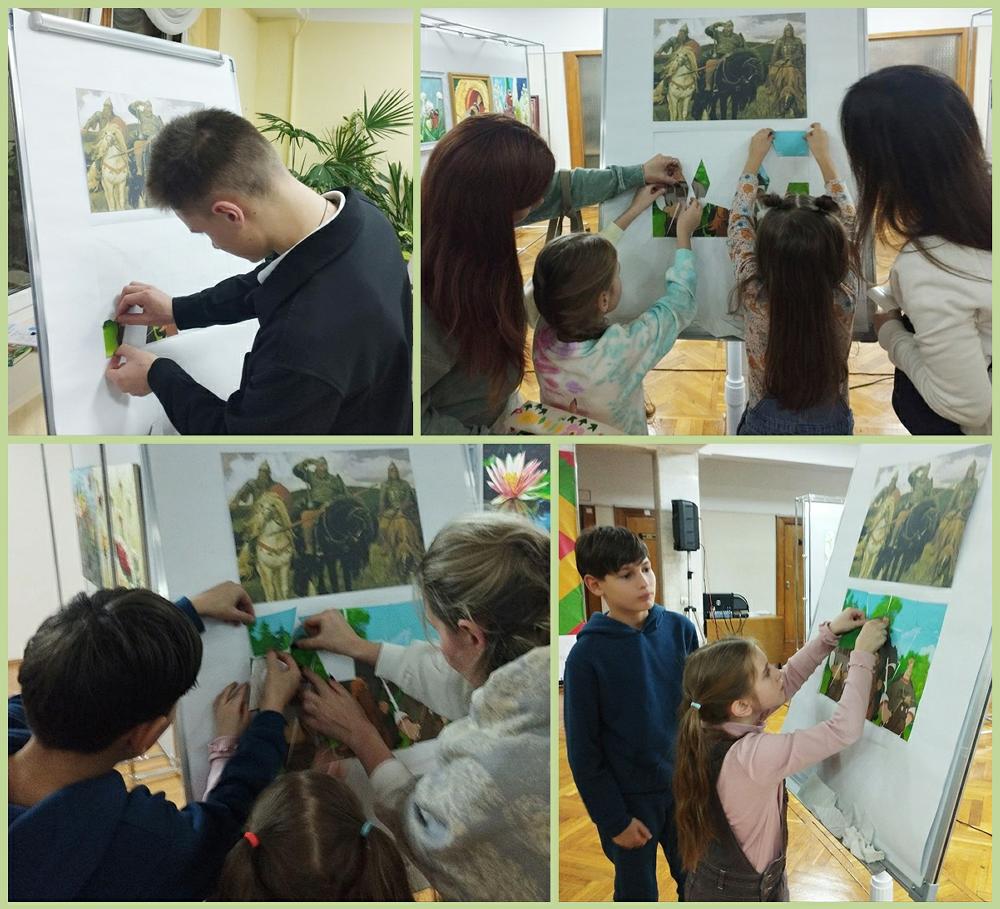 В течение всей Ночи на каждой локации гости получали кусочек пазла, который в итоге собрали все вместе в завершении акции «Ночь искусств-2025». Это, как Вы уже, наверное, догадались, было изображение трёх русских богатырей.