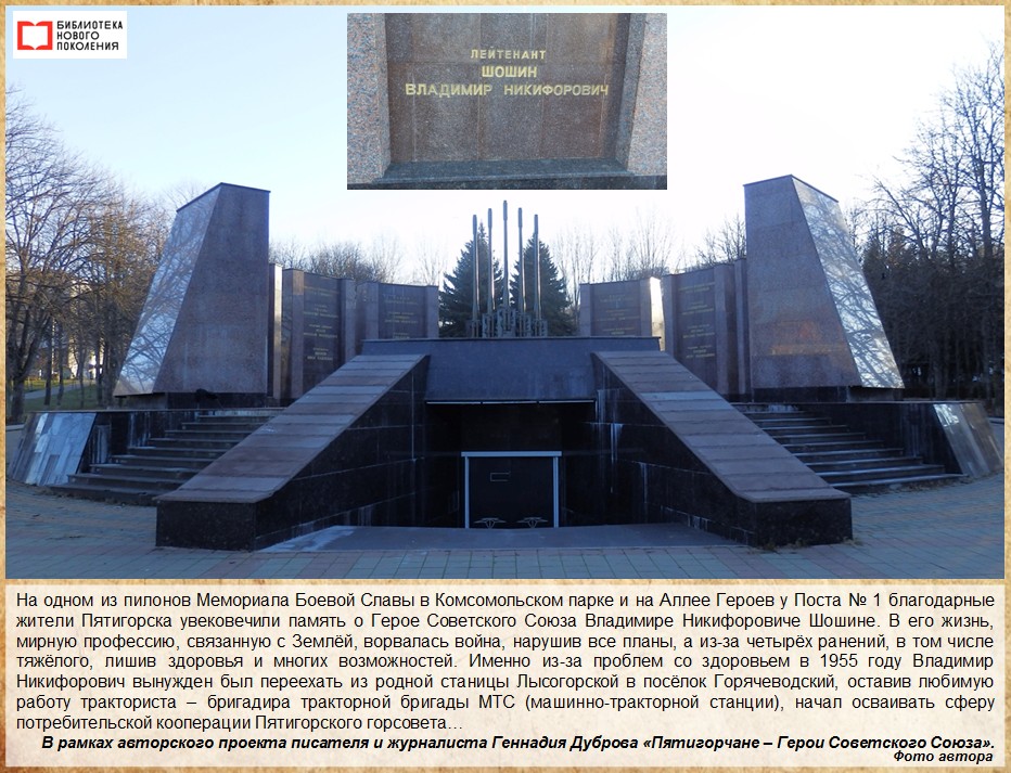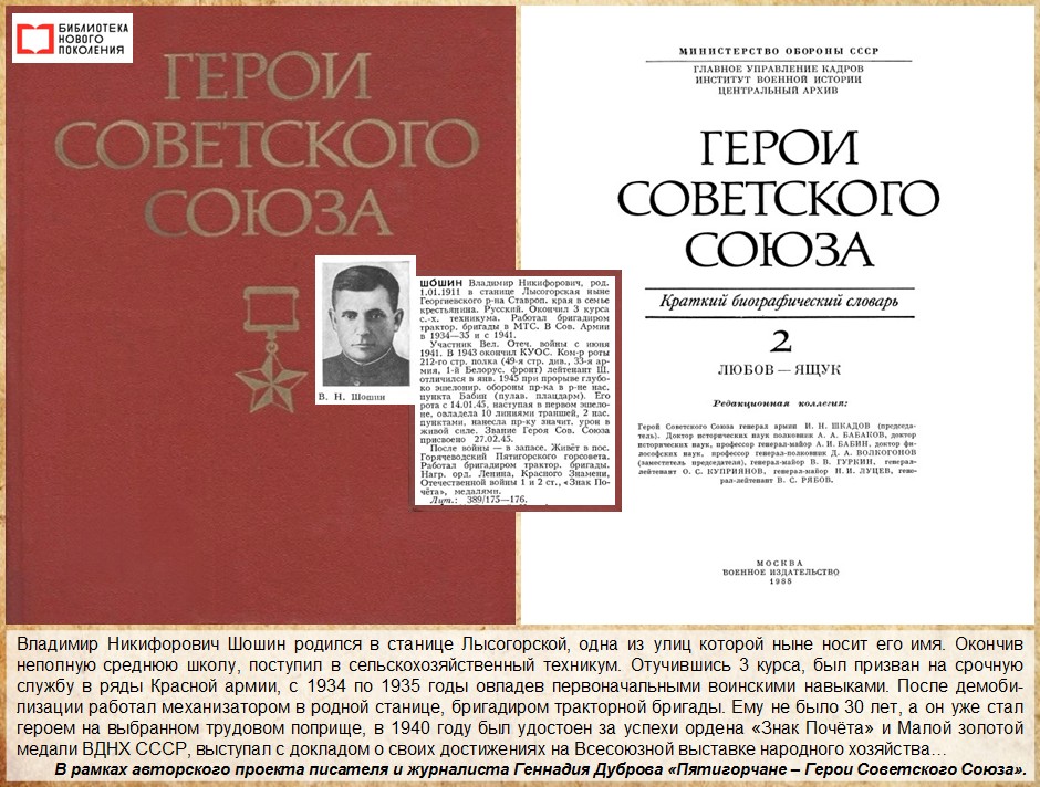 На 1 января выпадает день рождения пятигорчанина – Героя Советского Союза Владимира Никифоровича Шошина. Путь ратных подвигов, увенчанных «Золотой Звездой» Героя, для Владимира Никифоровича начался с первого же дня войны. Его, 30-летнего тракториста из станицы Лысогорской, отслужившего в рядах Красной Армии, призвали 22 июня 1941 года.