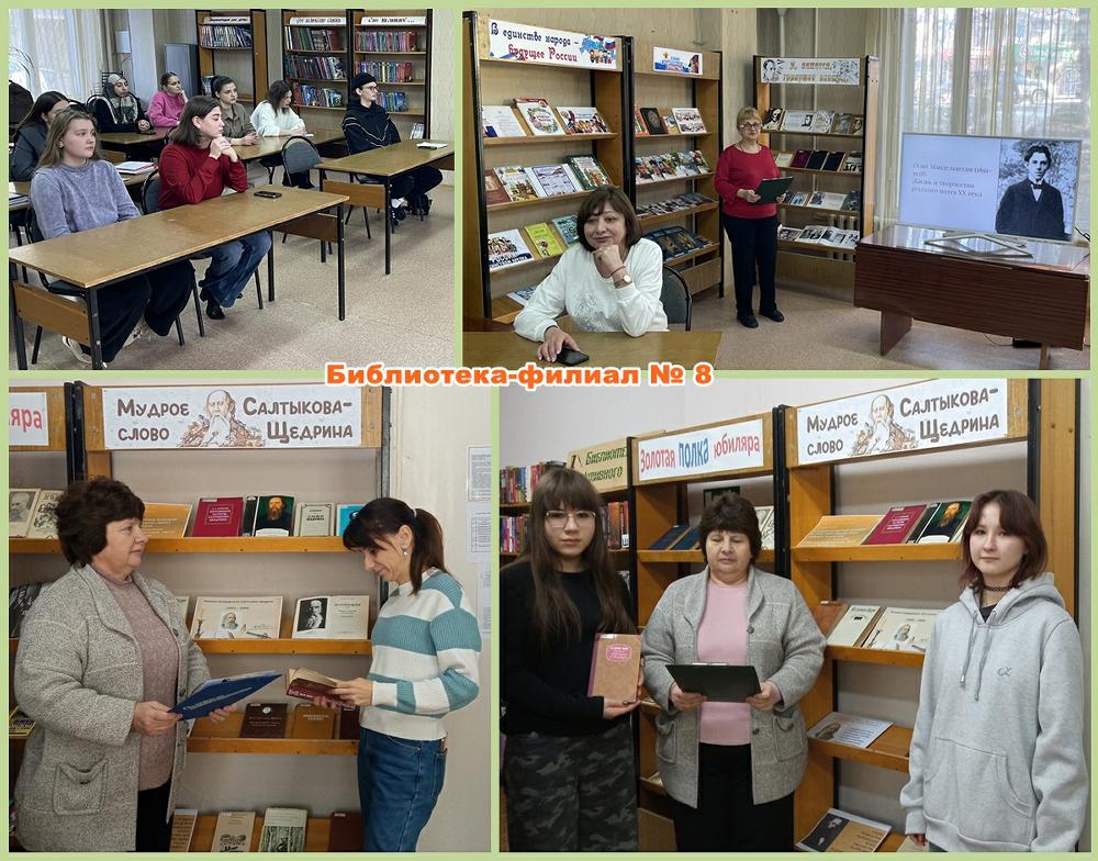 В библиотеке-филиале № 8 был проведён поэтический час, посвященный 135-летию со дня рождения Осипа Мандельштама, в котором приняли участие студенты 3 и 4 курсов ПГУ. А к 200-летнему юбилею Михаила Салтыкова-Щедрина в день рождения писателя все желающие могли принять участие в викторине-обзоре «Летописец сатиры».