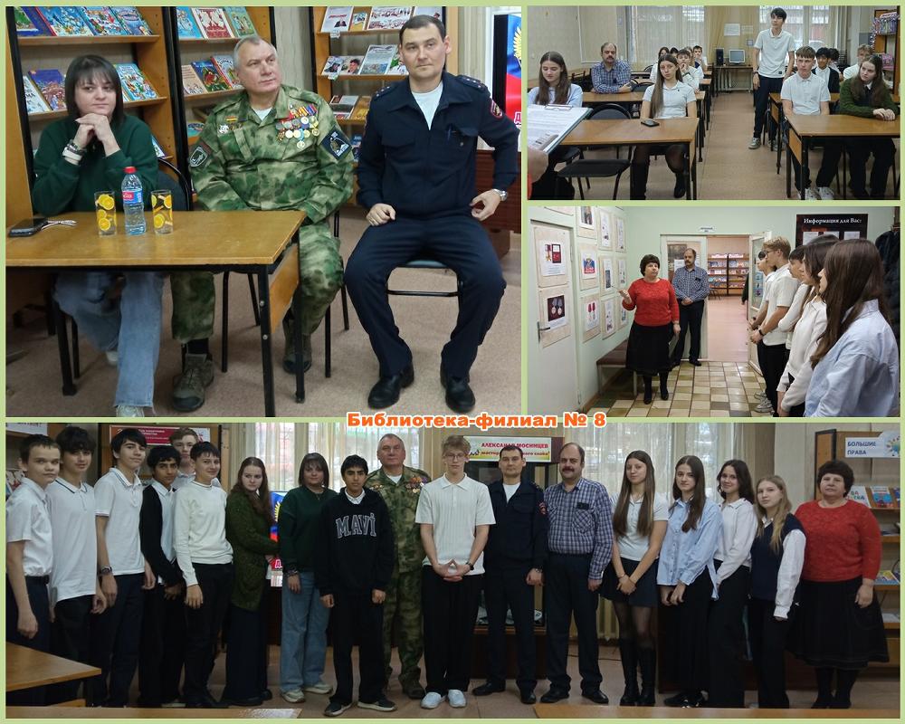11 декабря в библиотеке-филиале № 8 для учащихся 8 «В» класса школы-гимназии № 4 был проведён исторический час «Герои Отечества: прошлое и настоящее». Почётными гостями встречи стали социальный координатор Фонда поддержки участников СВО «Защитники Отечества Ставропольского края» Е. А. Харченко, участник СВО, ветеран боевых действий С. И. Гиренко и инспектор группы организации службы ОБ ДПС гос. автоинспекции г. Пятигорска Я. И. Садыкин. После просмотра видеофильма «Герои России моей» и мультимедийная презентация о героях Отечества разных лет, участники мероприятия ответили на вопросы викторины «Сильна героями Россия» и ознакомились с книжной выставкой «Гордимся славою героев». Станислав Иванович Гиренко, отмеченный за участие в СВО медалью «За отвагу» и другими наградами, рассказал школьникам о значении слов: герой, патриот, приказ, верность Родине.