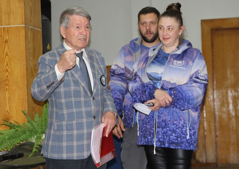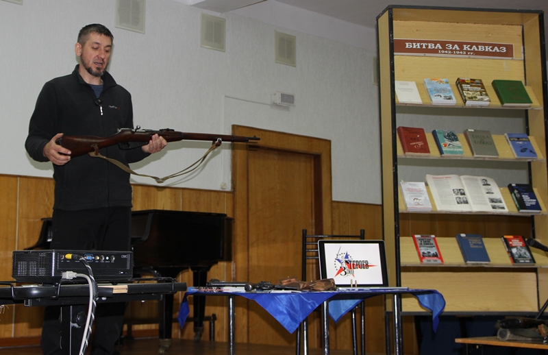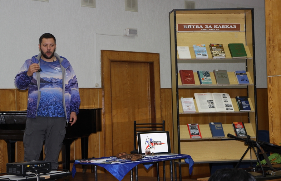 В этом году исполнилось 180 лет Русскому географическому обществу и 55 лет Пятигорскому отделению РГО. Краеведчекий центр «Пятигорье» организовал встречу учащихся города с членами правления Общества и его молодыми энергичными, полными идей и планов активистами. К своему двойному юбилею и 80-летию Победы, энтузиасты своего дела члены РГО, подготовили познавательную, патриотическую программу, которая называется «Земля героев». Председатель А. Асуров обратился к истории Русского географического общества в годы войны, остановив свое внимание на нескольких ярких и малоизвестных фактах участия РГО в военных действиях, кроме того его выступление коснулось и экспедиционной и общественной деятельности регионального отделения на современном этапе. По очереди выступали перед ребятами все члены Общества - В. Шпунтов, В. Стадник, Е. Стасенко, А. Федурина, Е. Сафронович и каждому было что показать и о чем увлекательно и красноречиво рассказать аудитории. Сотрудники справочно-библиографического отдела подготовили книжную выставку, посвященную одной из самых важных сражений Великой Отечественной войны - Битве за Кавказ. Самой познавательной частью можно считать выступление С. Демченко, который привез на встречу свою коллекцию обезвреженного (специально подготовленного для просмотра) боевого оружия. С огромным интересом школьники рассматривали наган, пистолет, винтовку, автомат, пулемет и затаив дыхание слушали о том, кто изобрел это оружие и в каких боях Великой Отечественной его использовали наши военнослужащие. Более двух часов шла встреча, но время пролетело незаметно, потому что выступающие сумели искренне, познавательно и убежденно поднять и раскрыть на примерах самую актуальную сегодня тему, тему патриотизма и ребята поняли главное — патриотизм выражается в делах, а не на словах. Приглашенные, организаторы и участники долго не расходились. Много вопросов прозвучало и на все вопросы невозможно было в формате одной встречи получить ответы и тогда возникла идея встретиться еще раз в начале следующего года.
