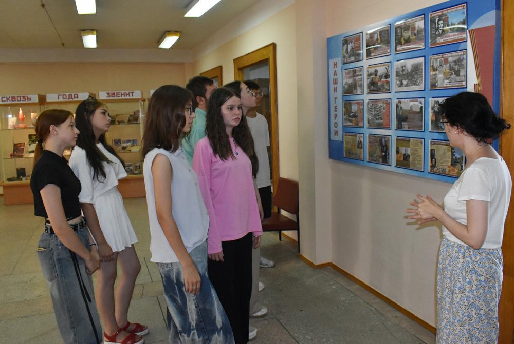 С экспозицией «Наши герои», открывшейся в Центральной городской библиотеке им. М. Горького в рамках 80-летия Великой Победы и Года защитника Отечества, познакомились участники летней школы неформального образования «Лаборатория лидеров».